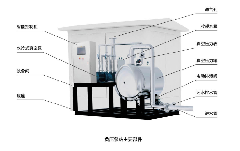 负压站是负压排水系统的动力源站,主要由真空压力罐、真空泵,排污泵、物联网智慧控制系统组成。收集来的污水在负压梯度力的输送作用下经负压污水管网进入真空压力罐。当污水收集罐内的污水液位上升到设定值时,排污泵启动或排污阀打开,将污水排至一体化污水处理设备或市政污水管网。